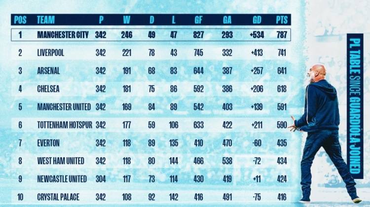 本赛季是瓜迪奥拉执教曼城的第九个赛季,期间球队六次夺冠,带队取得了惊人的787分,比第二名的利物浦多46分。阿森纳和切尔西则是仅有的其他两支积分超过600分的球队,曼联、热刺、埃弗顿、西汉姆和水晶宫则是同期始终在英超的其他俱乐部。