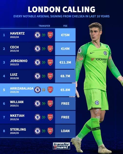 直播吧07月01日讯 随着阿森纳官方宣布签下前切尔西门将凯帕,德转也盘点了过去十年间阿森纳签下的切尔西球员,切赫、若鸟等人在列,包括上赛季租借加盟阿森纳的斯特林。其中,哈弗茨以7500万欧元转会成为阿森纳近十年从切尔西购买的最贵球员,凯帕以580万欧元位列第五。